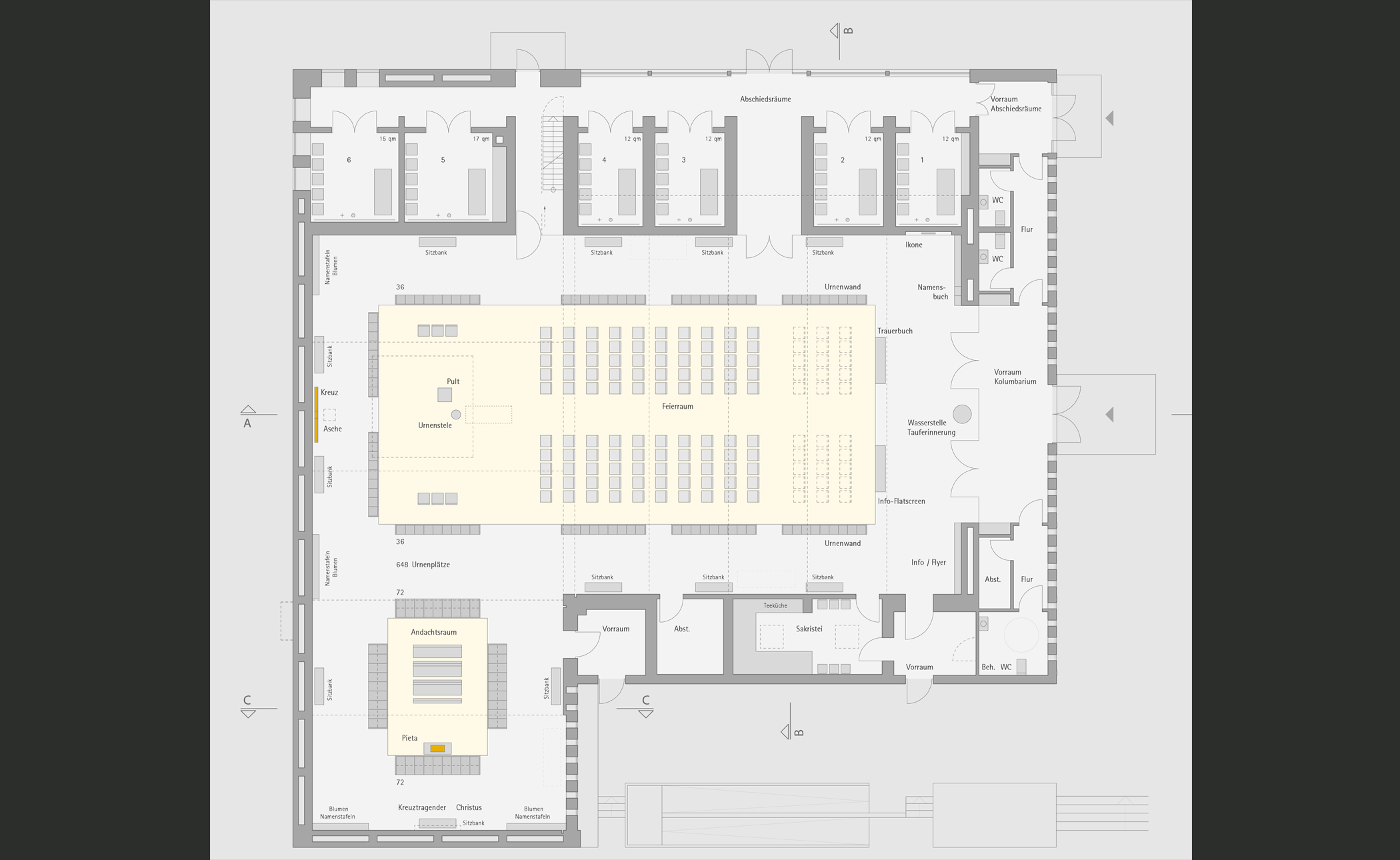 Gruppierung von Urnenwänden um einen Feierraum